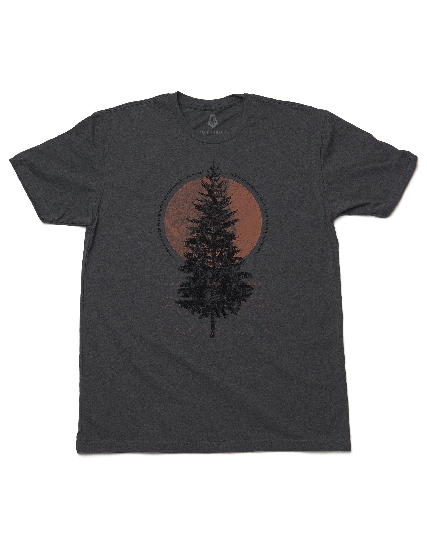 This men's/unisex graphic tee features an original illustration showcasing a pine tree and various topographic map elements combined into a harmonious nature themed tee.