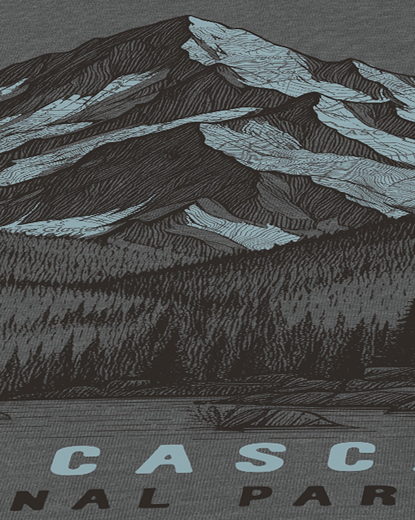 Get lost in the wild beauty of the Pacific Northwest with our North Cascades National Park T-shirt. Featuring a stunning hand-drawn mountain illustration, this design is loaded with crazy amounts of detail, from rugged alpine peaks to a dense forested valley below. Printed on a heather dark grey premium tee, the artwork uses a deep charcoal-brown ink for the mountains and trees, while a muted ice blue ink brings the snow-capped highlights to life — layered with an authentic topographic map texture straight from North Cascades National Park.